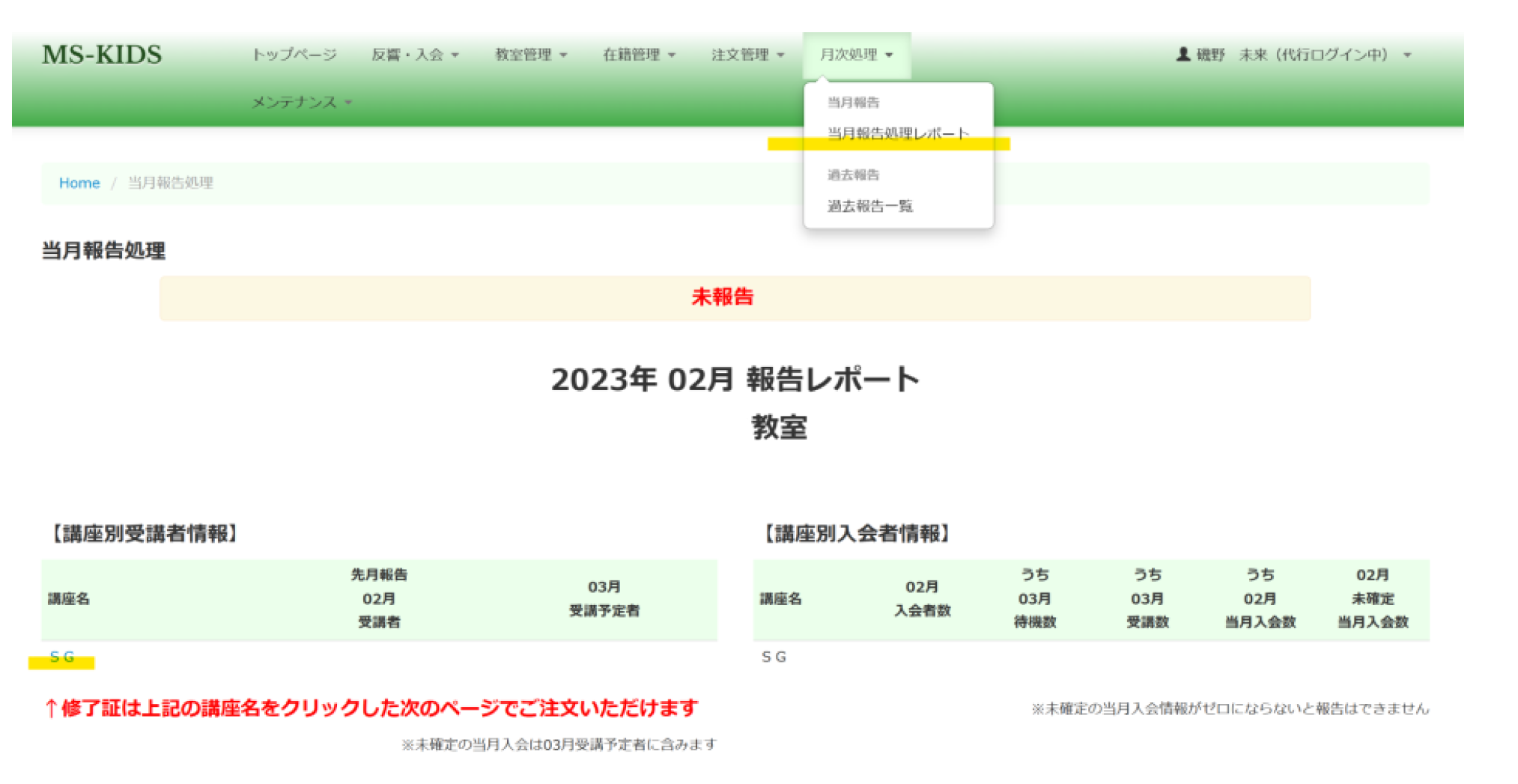 ①MS-KIDSトップ→月次処理→当月報告処理レポート→在籍している生徒さんの講座に進んでください。