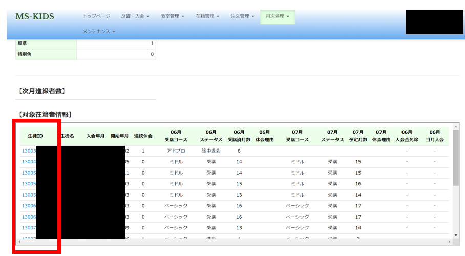 MS-KIDS>>在籍管理>>生徒一覧 より、