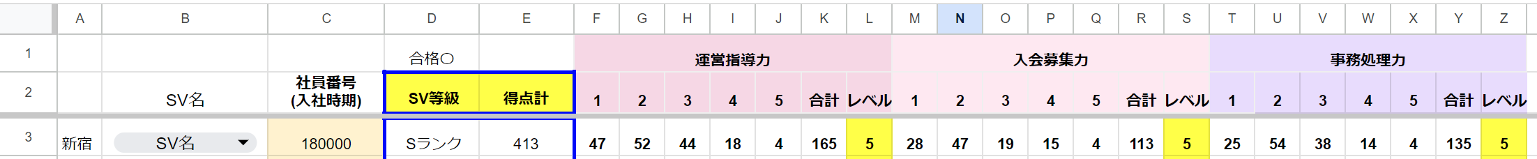③「合格〇」の項目に対し、集計がなされ、シート名「進捗状況」に得点とレベル、SV等級が表示されます。
