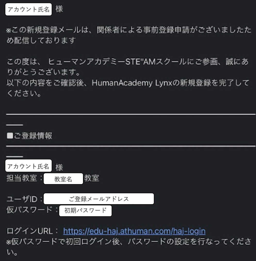 【Lynx】新規FCユーザーの登録をしたときに登録メールアドレスに案内メールが届くとあるがどのような内容か。 2024年06月12日 10:50 更新 以下の内容が送信されます。 件名:【ヒューマンアカデミー】Lynx(リンクス)にご登録ありがとうございます 内容: