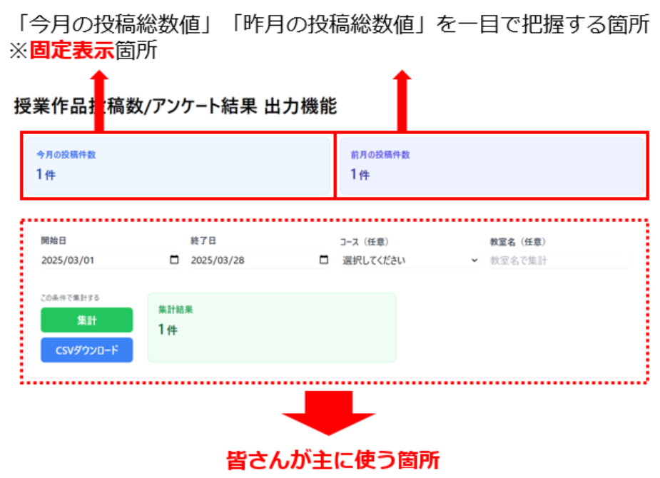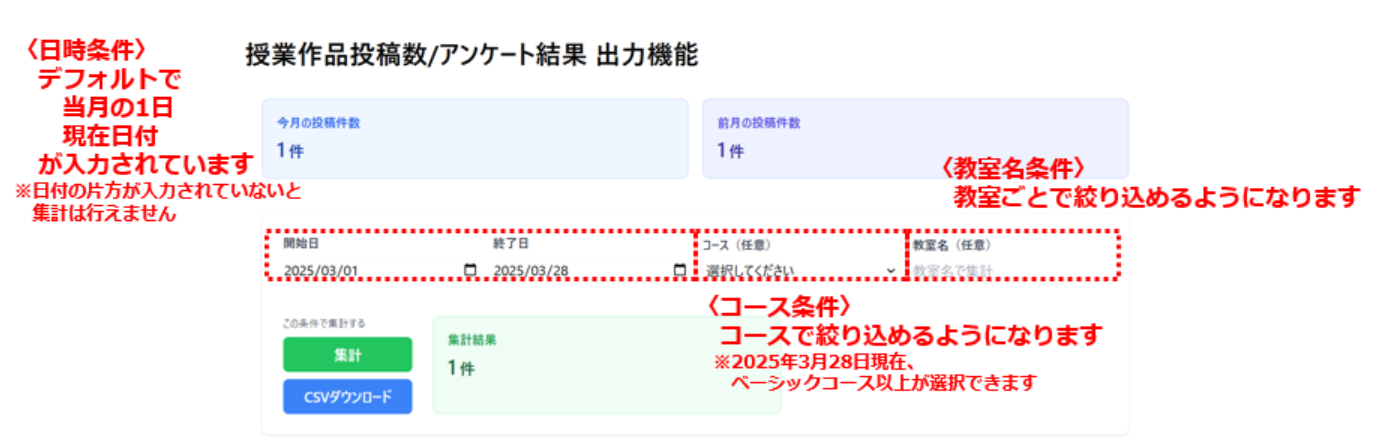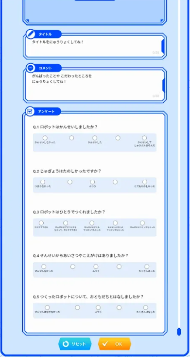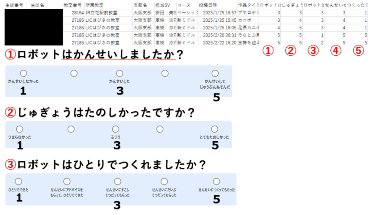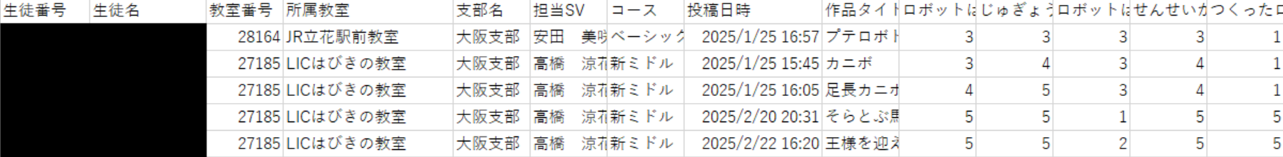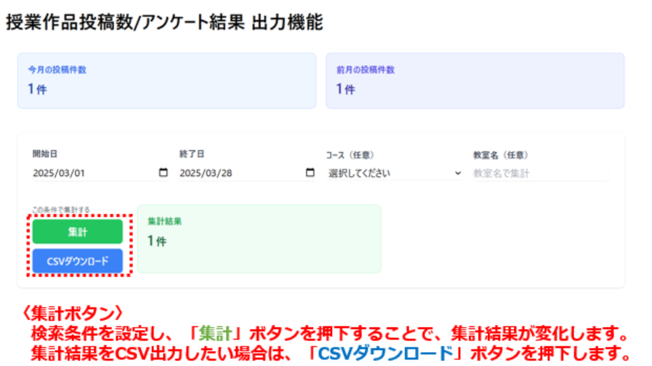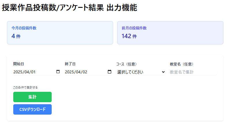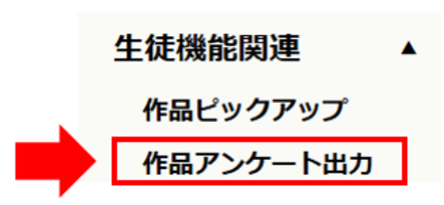 授業の作品アンケート結果を知りたい。 2025年04月02日 09:54 更新 メニュー箇所に「作品アンケート出力」が表示されます。 「授業作品投稿数/アンケート結果 出力機能」画面になります。 ※以下、資料説明になります CSV出力にて、生徒に紐づく下記情報が出力できます。 アンケート出力は、全5段階にて出力されます。 下記、ご参照ください。 ※CSV出力ーサンプルデータ ※各アンケートの説明 ※実際のアンケート画面(LynxKids)