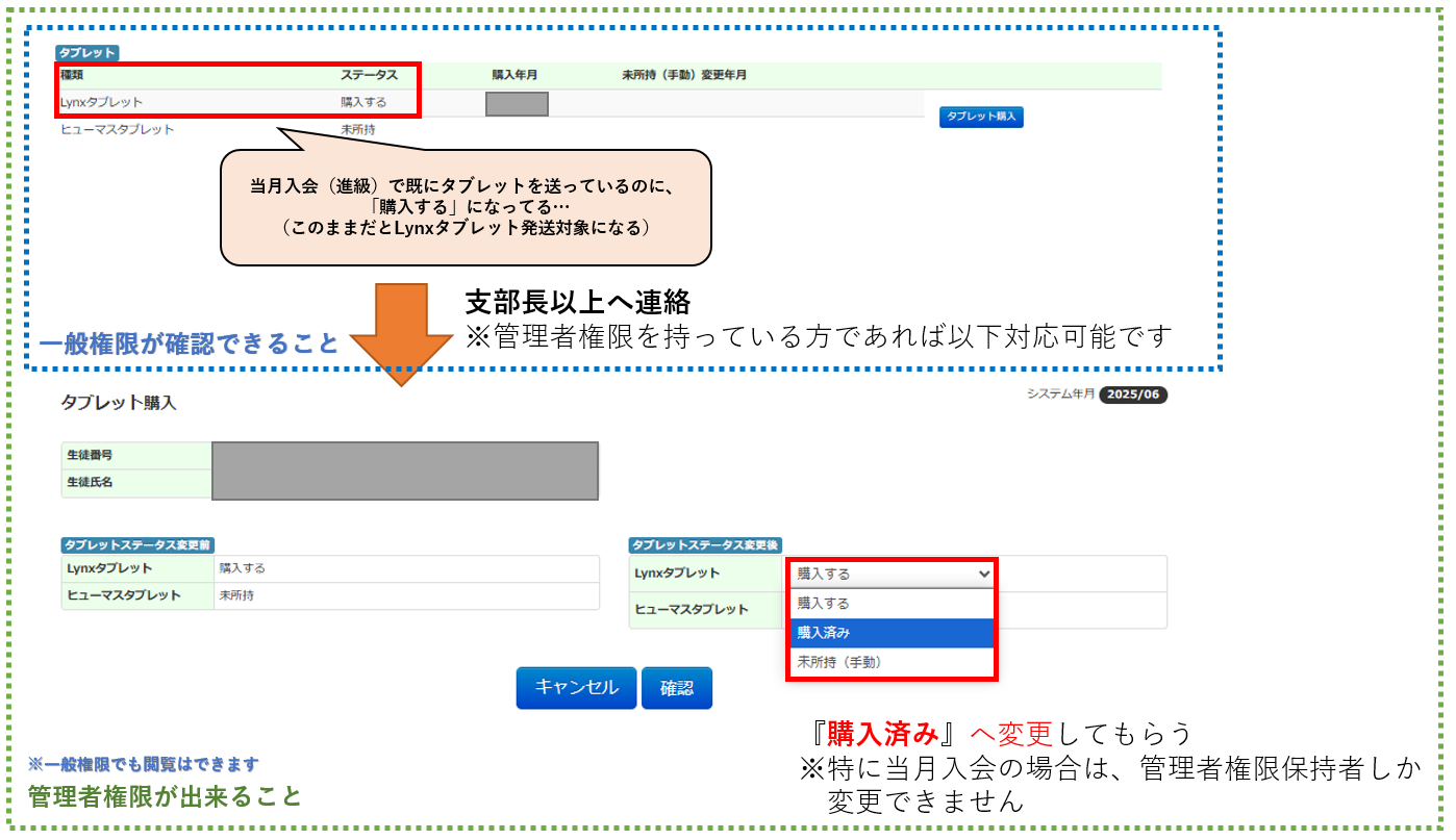 支部長へ「次月タブレット」を「購入する」から「購入済み」に変更していただくよう依頼します - 支部長が「次月タブレット」を「購入済み」に変更します