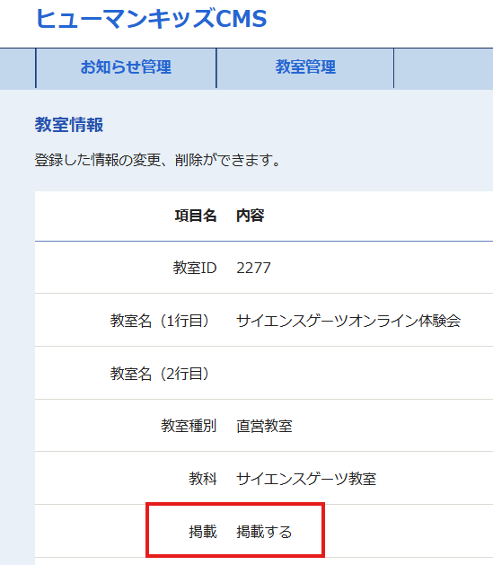 MS-KIDSの教室情報の何かしらの変更、WEB掲載情報変更の承認を行った場合