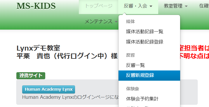 (1)当該教室に代行ログインし『反響入会』→『反響新規登録』をクリック