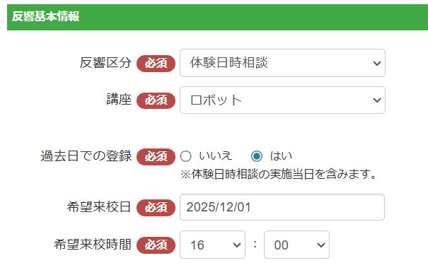 『過去日での登録』を『はい』に設定し体験実施の日付を入力