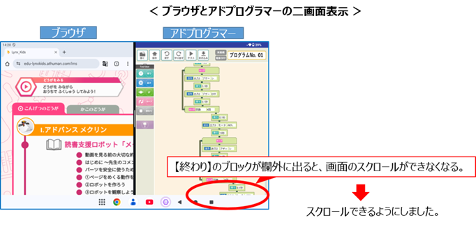 ②2画面表示時に【終わり】ブロックが画面外になると、スクロールできなくなっていましたが、